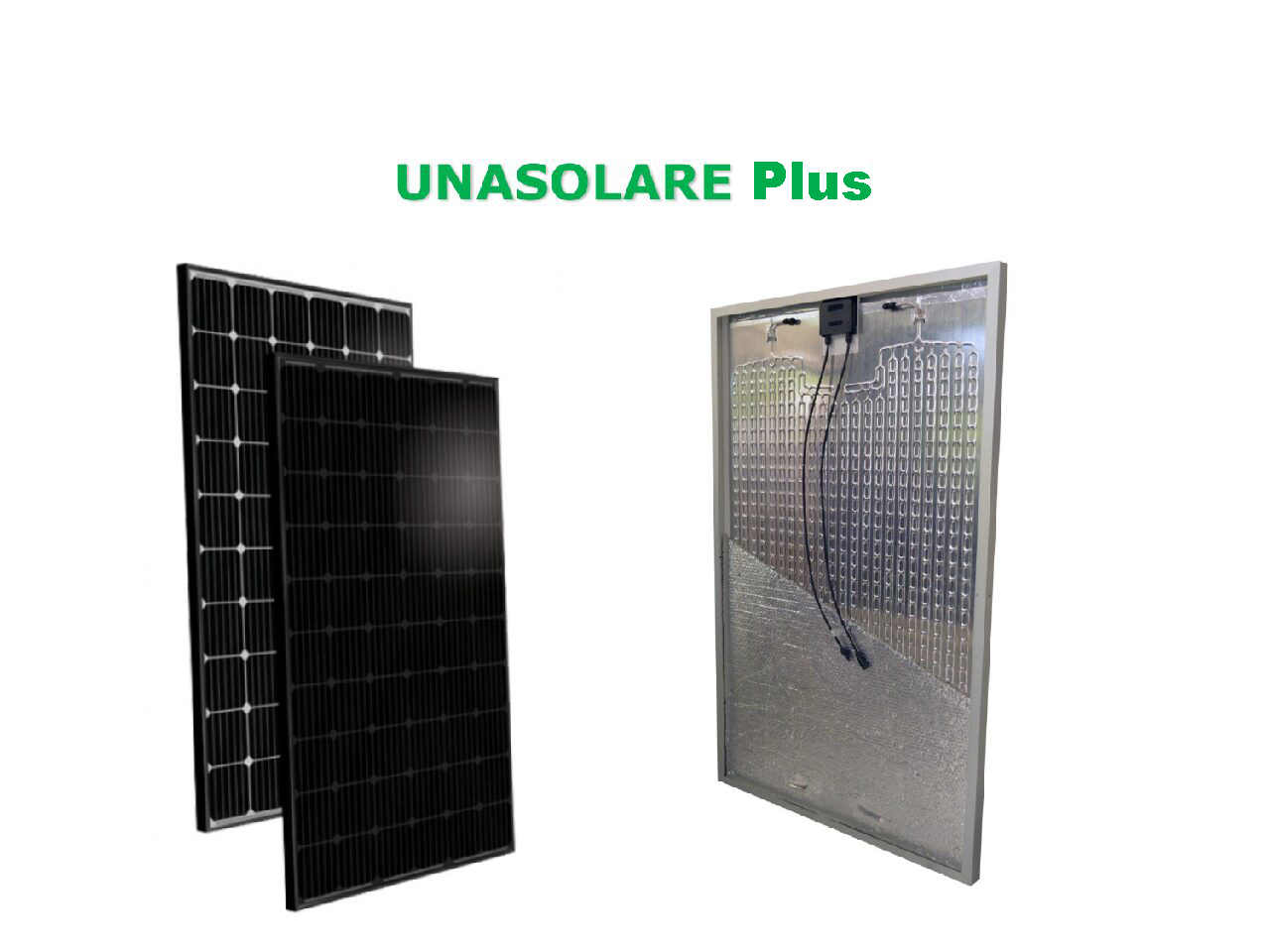 Grazie alla tecnologia Roll Bond abbiamo realizzato UnaSolare Plus un modulo solare ibrido composto da un pannello fotovoltaico 60 celle in tecnologia PERC, dove avviene la conversione dei raggi solari in energia elettrica, e da un collettore in alluminio detto roll bond posto in aderenza alla parte posteriore del pannello dove si ha generazione di energia termica che viene trasferita al fluido termovettore che scorre nel collettore.